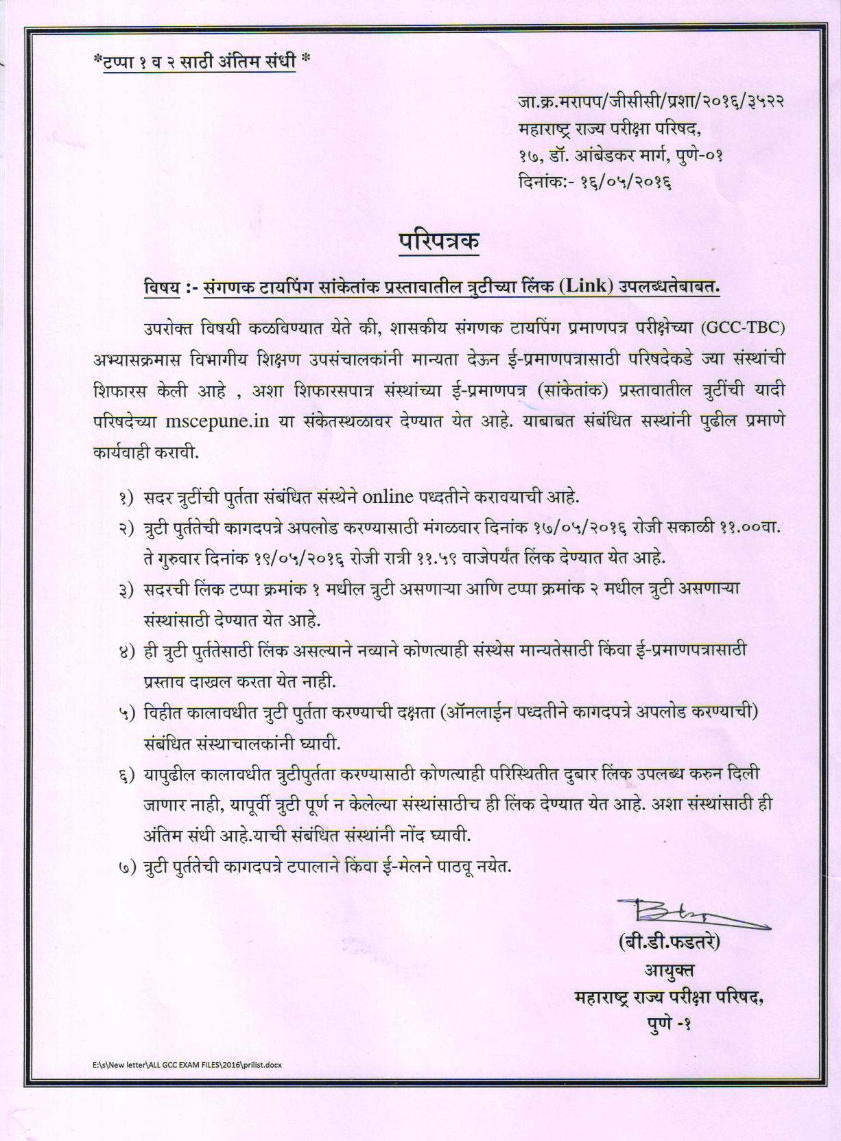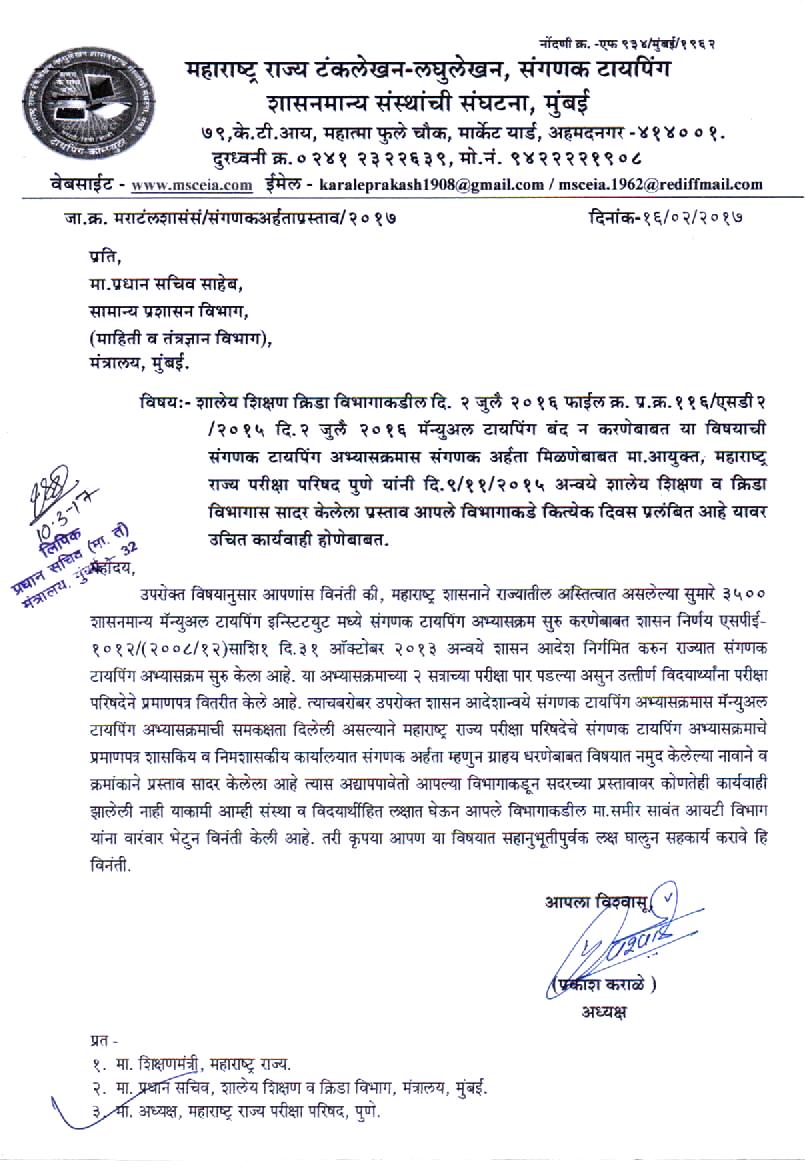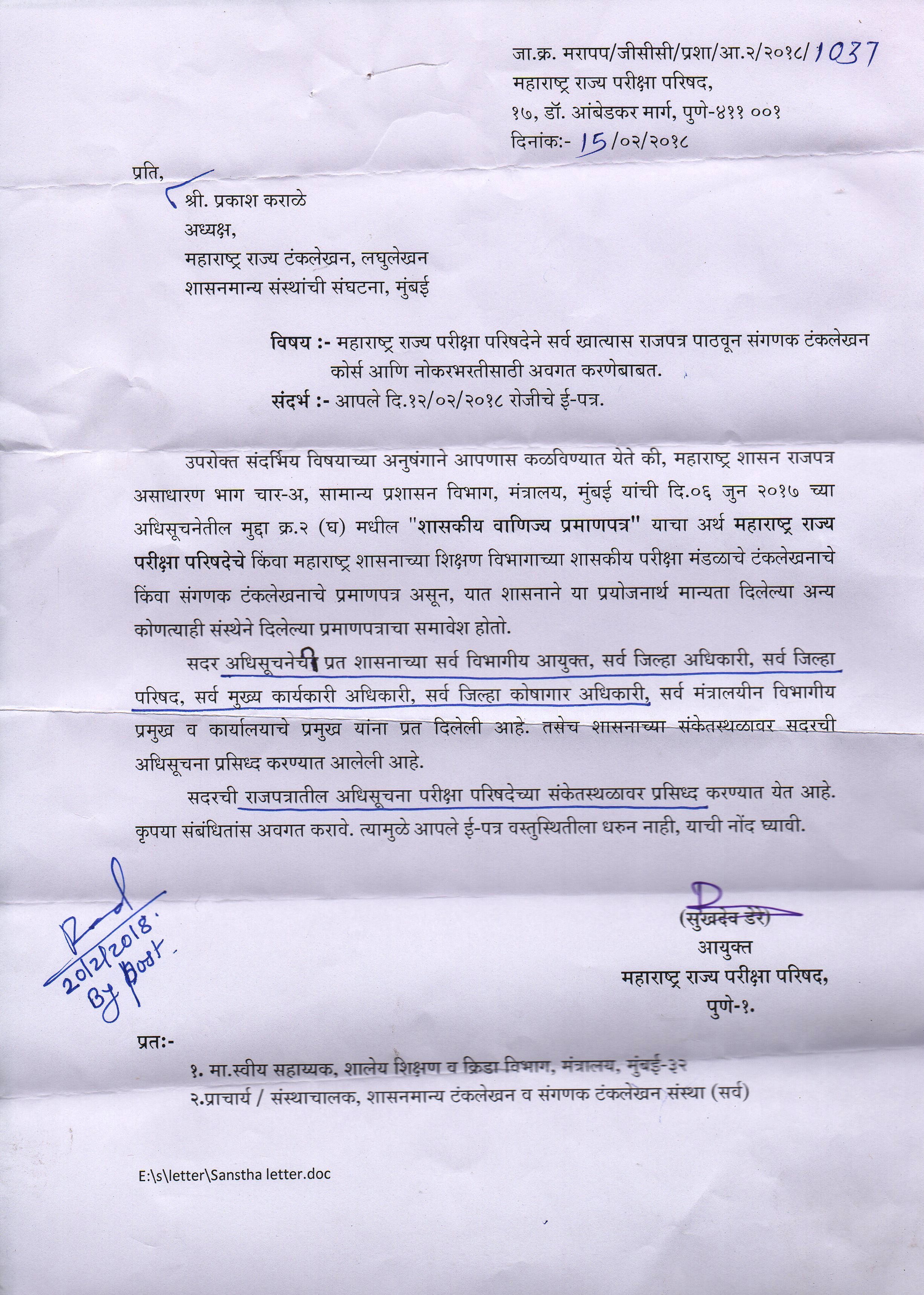 महाराष्ट्र राज्य परीक्षा परिषदेने सर्व खात्यास राजपत्र पाठवून संगणक टंकलेखन कोर्स नोकरभरती साठी लागू